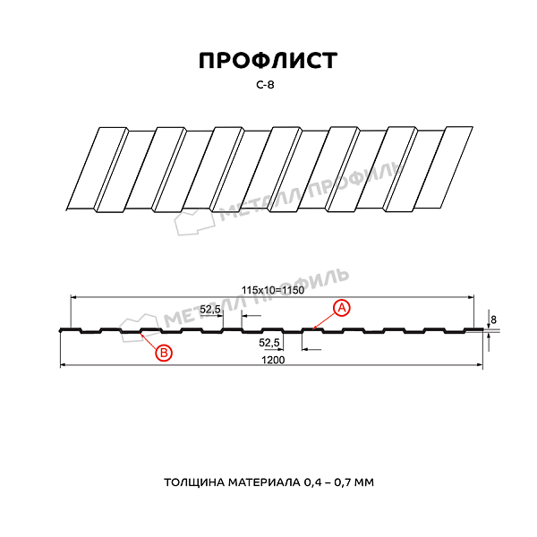 Профлист МЕТАЛЛ ПРОФИЛЬ С-8х1150-B (MattMP-20-8017-0,5) — популярный материал в Нижнем Новгороде для обустройства забора. Представляет собой лист оцинкованной стали с покрытием. Общая толщина металла с цинковым и полимерным слоем составляет 0.5 мм. Проходя процедуру холодного проката, металл приобретает рисунок из ритмичных волн. Такая форма придает профилю несущую способность.